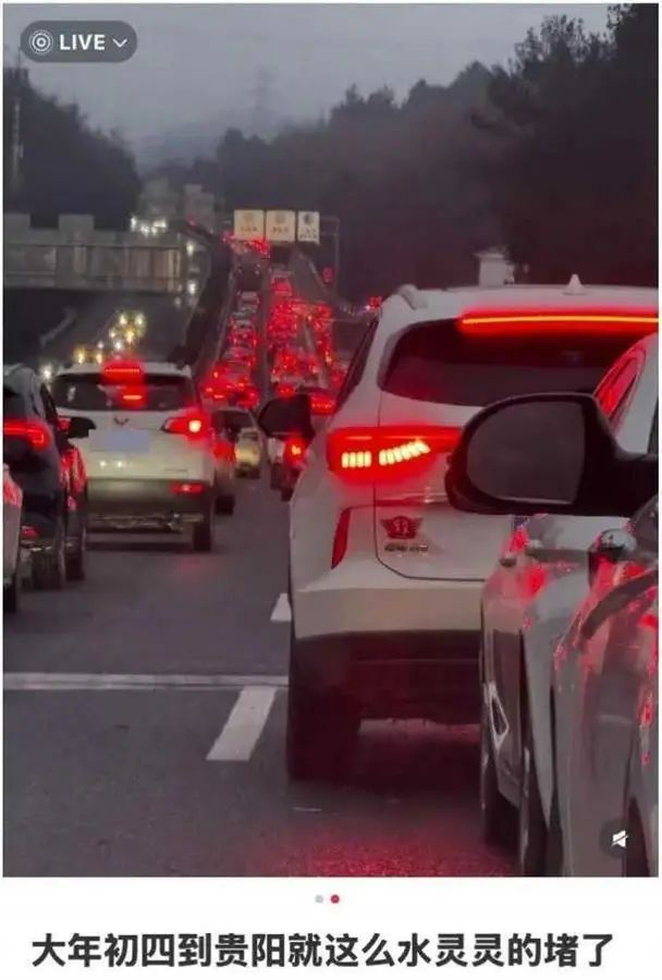 同样是在2月1日晚7时许,一名博主发帖称“大年初四到贵阳,就这么水灵灵地堵了”,具体堵车地址在“下高速观山湖往环城高速路口”,定位显示为G6002贵阳绕城高速入口(观山湖方向)。帖子所发动图显示,一段高速路上,车辆堵成长龙,集体闪起的尾灯映红夜色。2月2日,该博主回复记者称,这确实是2月1日的事情。