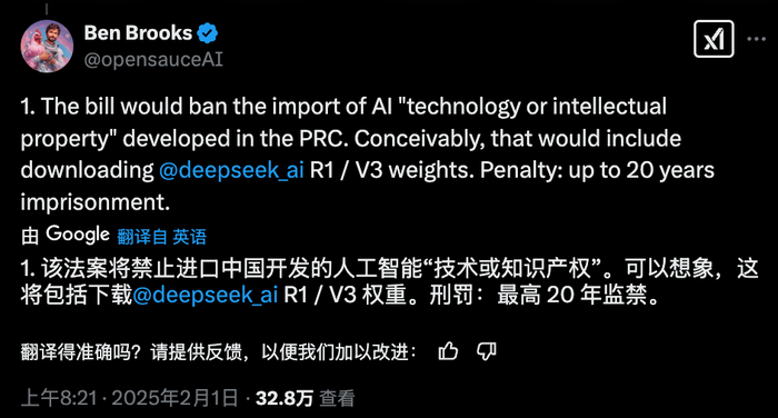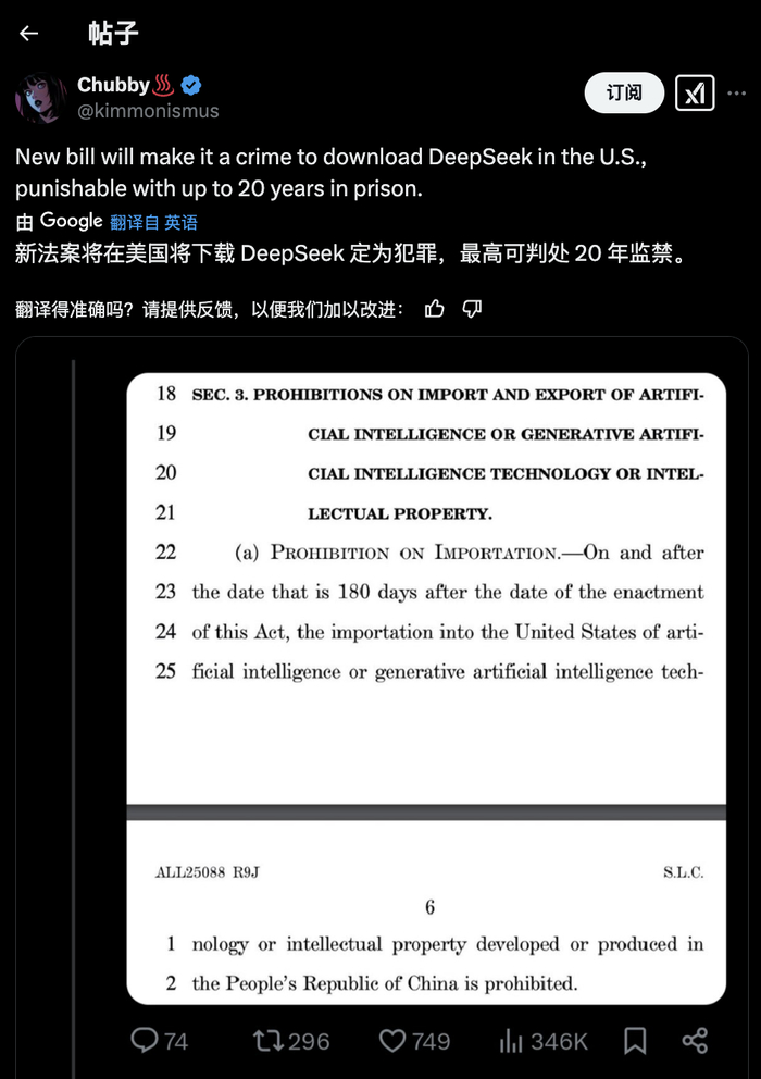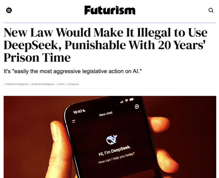 美国人下载DeepSeek,将被定为犯罪,可能意味着最高20年监禁和1亿美元罚款。