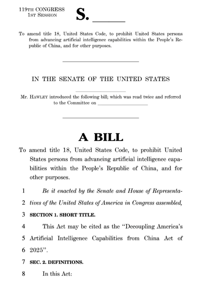2月3日的消息,美国共和党参议员乔什·霍利(Josh Hawley),提出一项新法案,旨在限制美国与中国在AI领域上的合作与交流。
