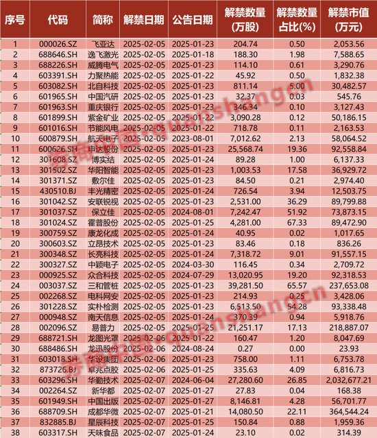 Wind数据显示,本周(2月5日—2月7日)A股市场将有38只股票面临解禁,合计解禁数量为19.33亿股,按最新收盘价计算,合计解禁市值为378.93亿元。从解禁股情况来看,本周华勤技术解禁市值超200亿元,成都华微解禁市值超30亿元。