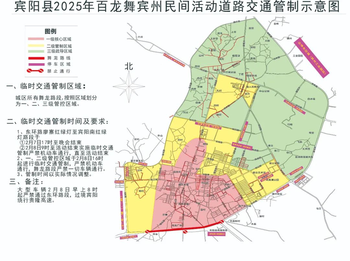 2、一、二级管控区域于2025年2月8日16时起进行临时交通限制措施,舞龙路段严禁一切机动车通行。结束时间以实际情况调整。