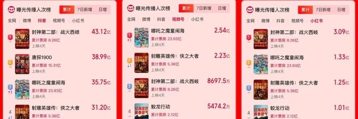 截至目前,抖音、小红书的累积话题数据量,最高的都是《封神第二部:战火西岐》,微博数据最高仍然是《射雕英雄传:侠之大者》。只有在视频号,票房冠军《哪吒之魔童闹海》的数据刚刚登顶,而且优势并不明显。