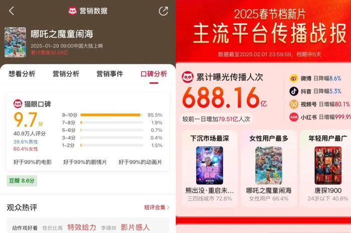 根据猫眼平台显示,冠军《哪吒之魔童闹海》的购票女性用户占比六成,为其传播数据贡献最多的也是女性用户,占比达66%。