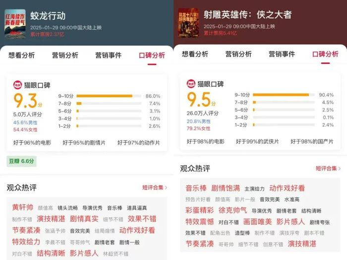 今年春节档营销整体谨慎保守的情况下,前期物料就成为管理预期的最重要一步。“优等生”《哪吒之魔童闹海》前期给到的预告、番外、广告以及哪吒敖丙人形玩偶物料,给观众建立起了特效、喜剧、藕饼CP的期待。等到上映验货时,只要这三点满足大众期待,差评占比便不会高。