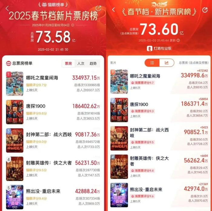 “一切都在预料之中。”江苏某影院王经理告诉硬糖君,今年春节档的整体表现符合预期。被普遍看好的三巨头《哪吒之魔童闹海》《唐探1900》《封神第二部:战火西岐》,一个超出预期,一个符合预期,一个低于预期。对影院来说,《哪吒之魔童闹海》超出预期的票房,弥补了《封神第二部:战火西岐》低于预期的损失。