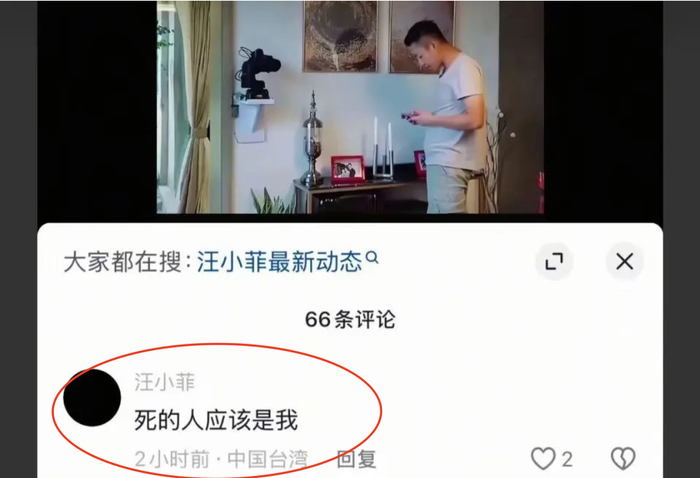 4日下午,有网友在抖音平台发现,一则《幸福三重奏》综艺中汪小菲与大S的视频下,汪小菲分别留下了三条留言,分别为“我好想你”“老婆,我好想你”“死的人应该是我”。其IP地址显示为中国台湾。