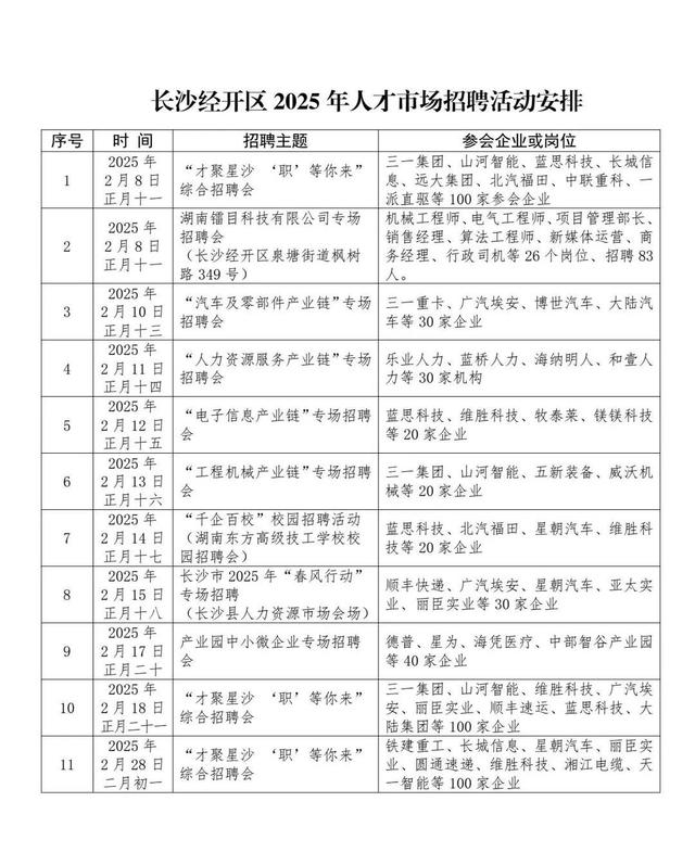 自2月6日起,长沙经开区将陆续组织开展“新春招聘月”一系列活动,共铺排招聘活动22期(具体安排见附件),其中: