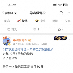 2月3日,导演程青松发布了与梁祐诚初相识的聊天截图,并称:“去年10月5号加的微信说了有空见,最后一次微信联系是11月30日。祐诚,希望你去了光明处,人生无常,珍惜每一刻当下 。”