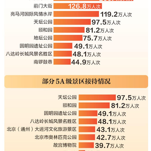 此外,北京12家市属公园及中国园林博物馆共接待308万市民游客,大家到公园中打卡中轴线、赏花纳福、体验民俗,感受浓浓年味儿。游客接待量前三名的是天坛公园、颐和园、景山公园。