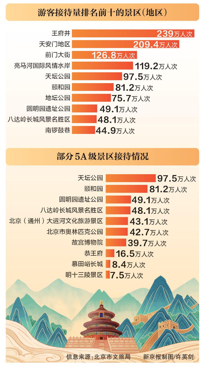 游客接待量排名前十的景区(地区)为:王府井、天安门地区、前门大街、亮马河国际风情水岸、天坛公园、颐和园、地坛公园、圆明园遗址公园、八达岭长城、南锣鼓巷。