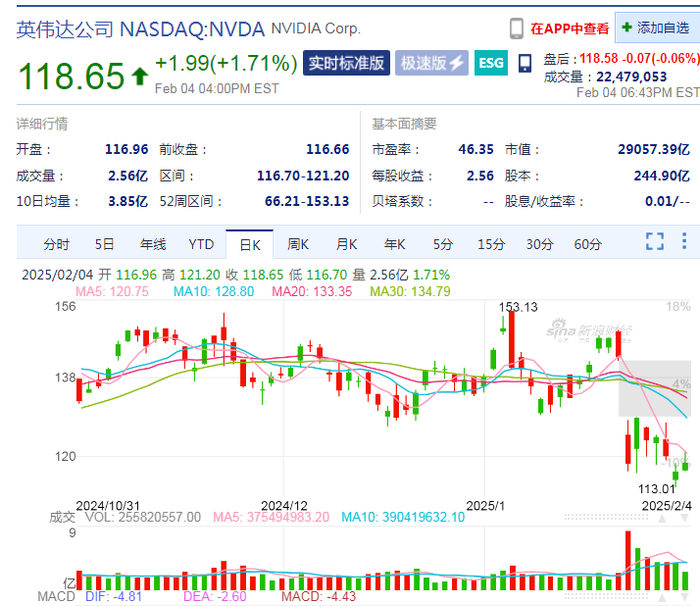 值得注意的是,作为全球AI芯片龙头,英伟达正在遭遇市场猛烈抛售,当地时间2月4日,英伟达股价报118.65美元,相较于今年1月的高点(153.13美元),累计跌幅达23%,总市值累计蒸发超8444亿美元(约合人民币6.1万亿元)。
