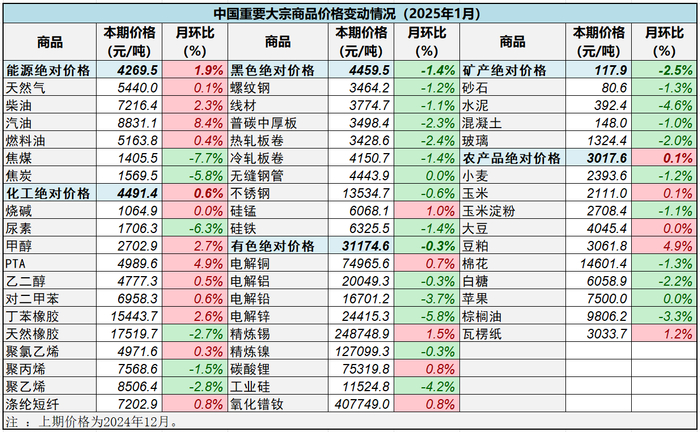 分商品看,在中国物流与采购联合会重点监测的50种大宗商品中,本月价格与上月相比,29种(58%)大宗商品价格下跌,21种(42%)大宗商品价格上涨。1月涨幅前三的大宗商品为汽油、PTA和豆粕,月环比分别上涨8.4%、4.9%和4.9%;跌幅前三的为焦煤、尿素和电解锌,月环比分别下跌7.7%、6.3%和5.8%。