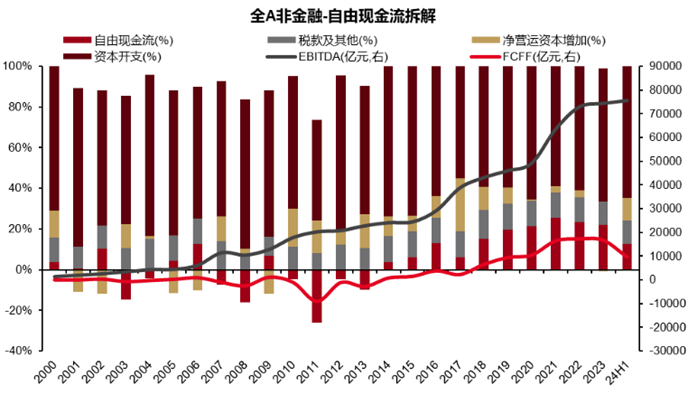 2000-2013年全A自由现金流(非金融,下同)正负波动,累计为负;从2014年同比转正以来每年稳定增长,2020年起达到万亿。2024H1有所下降,主因地产链拖累,部分上游企业应收款项增加较多,运营资本显著增长导致,原因上分析或为阶段性波动。后续随着“稳增长”政策的落地,企业回款有望改善,自由现金流改善趋势不变。