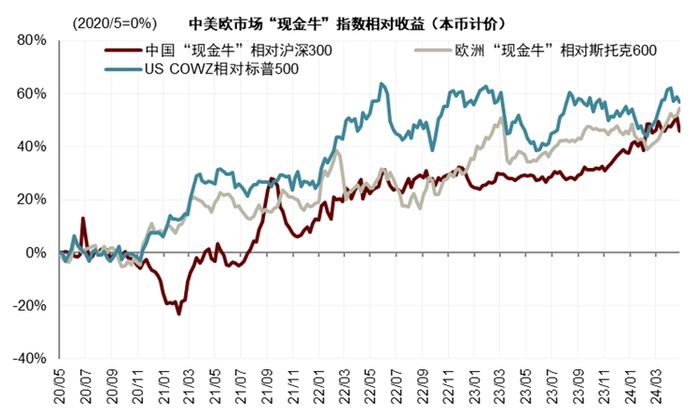 根据中金公司研究部测算,2020年以来中、美、欧市场上“现金牛”指数 (以本币计价)表现不俗,而且趋势跑赢相应的大盘指数。美国的现金牛100 ETF过去一年也成为全球资本市场的香饽饽,规模大幅飙升。