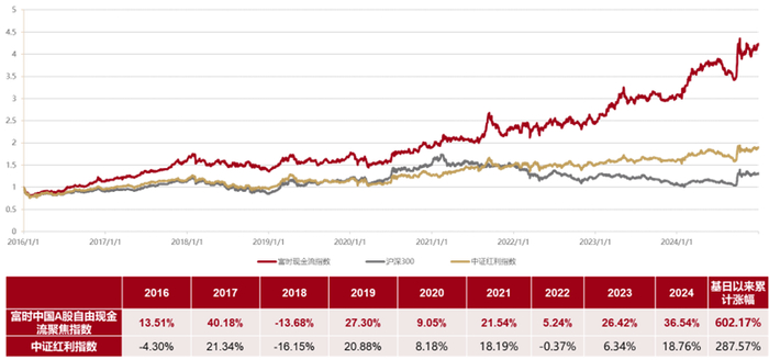 实际上,A股的 “现金牛”行情也依然存在,以富时自由现金流聚焦指数为例,2016年-2024年连续9年跑赢中证红利指数。且连续6年实现正收益。特别是在红利资产大放异彩的2024年,富时自由现金流指数涨幅36.54%,相比中证红利指数超额近18%。