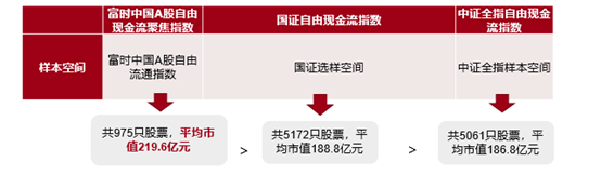 这样的指数特征其实与指数的样本空间有很大的关系。富时自由现金流指数的样本空间为富时中国A股自由流通指数,共有975只股票,平均市值219.6亿元。此外,同时按自由现金流率筛选,富时中国A股自由现金流聚焦指数含有50只成分股,而国证自由现金流指数、中证全指自由现金流指数均含有100只,富时中国A股自由现金流聚焦指数选股更加集中,可以说“优选现金流龙头”。