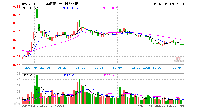 2月5日,酒ETF(512690)开盘涨0.53%,报0.573元。酒ETF(512690)重仓股方面,贵州茅台开盘涨0.35%,五粮液涨0.28%,泸州老窖涨0.04%,山西汾酒涨0.00%,洋河股份涨0.00%,今世缘涨0.57%,青岛啤酒涨0.03%,古井贡酒跌0.05%,燕京啤酒跌0.18%,重庆啤酒涨0.13%。