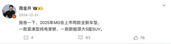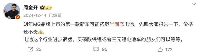 上汽集团名爵品牌事业部总经理周钘在社交媒体上表示,MG明年上市的第一款新车可能搭载半固态电池,价格还不贵。并且在回答网友提问时,周钘表示,新车将标配半固态电池。同时,MG品牌明年也会引入DMH插混动力系统。这款搭载半固态电池的车型有可能将定位为全新紧凑型轿车,同时名爵还将推出一款新能源大五座SUV车型。