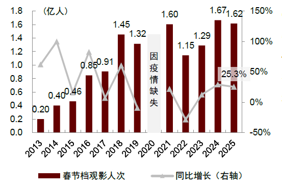 图表:2025年春节档观影人次同比增加25.3%