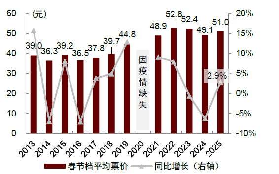 图表:2025年春节档平均票价同比上升2.9%至51元