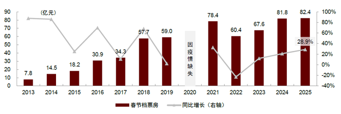 图表:2025年春节档票房同比增长28.9%至82.4亿元