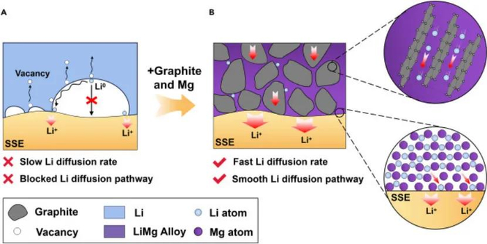 全固态锂金属电池(ASSLMBs)以其不可燃性特性和高能量锂(Li)金属化学而闻名,为同时实现高能量密度和增强安全性开辟了新的途径。在各种固态电解质(SSE)的选择中,硫化物电解质由于其特殊的室温离子电导率(>1 mS cm−1)、优异的力学性能、和大规模生产的潜力而获得了广泛的关注。其中,建立一个稳定的电化学界面是ASSLMBs的实际实现的关键。然而,界面接触不足主要是由于锂金属不均匀表面与SSE之间的点对点接触有限所致。采用了施加压力、熔化锂金属或构建人工界面层等技术,将初始点对点接触转化为面对面接触,从而将初始界面阻抗降低到50 Ω cm−2以下。然而,即使有良好的界面固体接触,在循环期间或在高容量(≥1.0 mAh cm−2)和高电流密度(≥2.5 mA cm−2)的条件下,仍会发生持续的降解。其中一种重要原因是,Li空隙的积累导致了连续循环中界面接触的逐渐退化。在Li剥离过程中,负极界面上空洞的形成是由于有限的固有Li扩散速率(−11 cm2 s−1)。随着剥离能力的增加,锂空洞逐渐积累,最终导致从稳定接触到接触损失的形态演化。其中,累积的Li空隙导致电场分布不均匀,加速了随后在固体界面的析锂,最终形成枝晶,降低了负极对Li的利用。