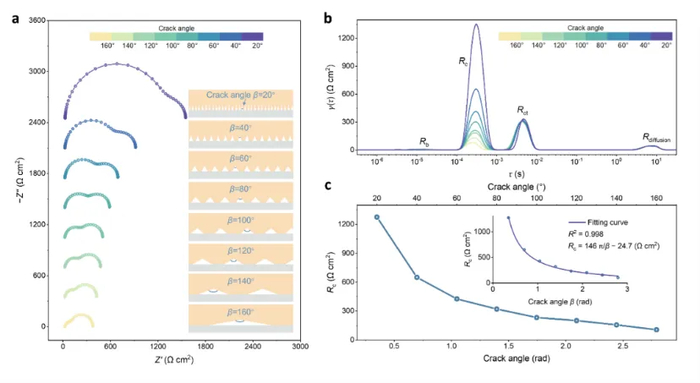研究团队基于有限元方法构建了全固态电池电化学阻抗谱模拟的二维模型,对不同界面固固接触下的电化学阻抗谱进行了模拟。通过等效电路模型和弛豫时间分布技术的辅助分析,提出了接触阻抗与界面孔隙率/裂纹角的反比例经验关联。通过弛豫时间分布和等效电路拟合,发现锂枝晶诱导的裂纹尖锐程度会影响 全固态电池的阻抗。裂纹角度越小,接触阻抗越大,而体相阻抗和电荷转移阻抗没有明显变化。与裂纹角也呈反比例关系。裂纹角效应表明,锂与固态电解质界面上的尖锐枝晶和裂纹对全固态电池更不利。因此,提高固态电解质的平整度有利于促进锂的均匀沉积。相关成果以“Unveiling Solid–Solid Contact States in All-Solid-State Lithium Batteries:An Electrochemical Impedance Spectroscopy Viewpoint”为题发表于J. Energy Chem. 2025,101, 16–22.