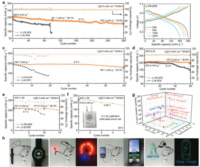 固态聚合物电解质因其出色的加工性和适用性,有望推动固态锂金属电池的实际应用进程。但是,聚合物链段中的离子传输缓慢和电极/电解质之间的固有界面接触不良,尤其在高面容量的正极材料中,会导致严重的极化问题。在固态聚合物系统中,锂枝晶的生长问题比液态系统中更为严重,这进一步限制了聚合物固态电解质的实际应用。为了解决上述问题,通常采用具有快速离子传输特性的醚基聚合物作为主体,并采用原位聚合策略以实现电池内部各个界面的有效接触。通过添加剂(如LiNO3, AlF3等)和合金化(如Li-Al, Li-Sn合金等)策略,在pDOL系统中构建富含无机成分的界面和亲锂界面,以实现锂的均匀沉积。同时,使用常规的锂盐(如LiDFOB)来增强正极材料的稳定性。