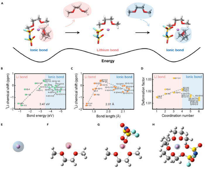 研究团队以电解液中锂离子与溶剂、阴离子形成的不同配位结构作为模型体系,计算中心锂原子对应的NMR化学位移。结果显示,随着总键能增大、平均键长增长、配位数升高,7Li化学位移呈现先向低场移动、后向高场移动的变化趋势。以4配位为临界点,低(小于等于4)和高(大于4)配位数时锂与配位原子成键分别对应锂键和锂离子键,其中形成锂键时的NMR信号随键能的变化规律与氢键体系的规律一致。进一步采用NMR对电解液中的锂键和锂离子键进行了定量区分,发现锂键由局域电子效应主导而锂离子键由静电作用主导的特征,由此揭示了锂键的化学本质。相关成果以“Identifying the Lithium Bond and Lithium Ionic Bond in Electrolytes”为题发表于Chem2025,11, 102254.