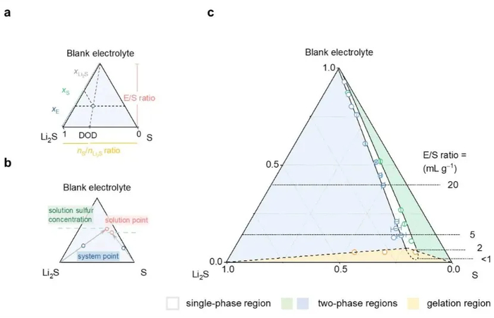 研究团队开创性地使用了相尺度下的热力学多相平衡分析方法来研究锂硫电池化学机制,确定了锂硫电池体系的自由度数,测定并构建了由电解液−单质硫−硫化锂三组分描述的锂硫电池三元相图,建立了三元相图与实际电池体系组成之间的对应关系,并在此基础上精确地描述了锂硫电池中各相的平衡组成与浓度演变,突破了传统的光谱分析方法的限制。基于三元相图,首次指认了锂硫电池中凝胶区的存在,对应于体系在极低电解液用量下的电解液凝胶化行为和实际器件大幅增加的极化,展示了相平衡分析方法对于实际电池器件性能调控的重要意义。相关成果以“Phase Equilibrium Thermodynamics of Lithium–Sulfur Batteries”为题发表于Nat. Chem. Eng.2024, 1, 588–596.