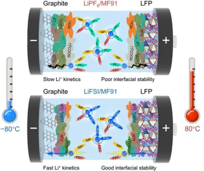磷酸铁锂电池不仅占据了储能市场的主导地位,在动力电池领域也比层状氧化物/石墨电池拥有更大的市场份额。然而,在低温和快充条件下,商用锂离子电池表现极为不佳,这主要是由于石墨负极侧动力学缓慢以及随之而来的析锂问题。此外,正极动力学的限制也会对电池的倍率能力和低温容量产生不利影响。商用磷酸铁锂电池正极的电化学动力学仍然不如层状三元正极,这使得磷酸铁锂电池在快充和低温下运行时面临更严峻的挑战。为了解决这些问题,拓宽电解液低温液程和提升电解液/电极界面锂离子传输动力学至关重要。