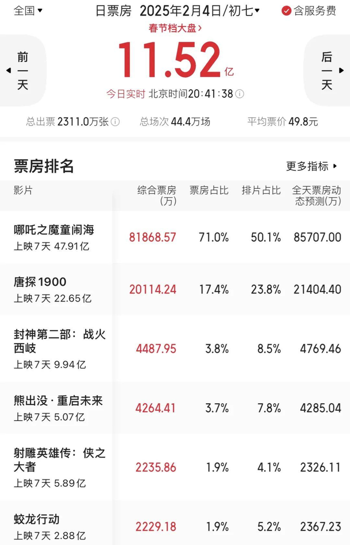 没想到还真让他说中了,虽然这一刻来得比预计中晚了一些,但2025年,《哪吒之魔童闹海》(以下简称《哪吒2》)确确实实正在以势如破竹般的姿态冲击70亿票房,截止到2月4日晚,已经完成了将近70%的票房目标,进入了中国影史票房前五。
