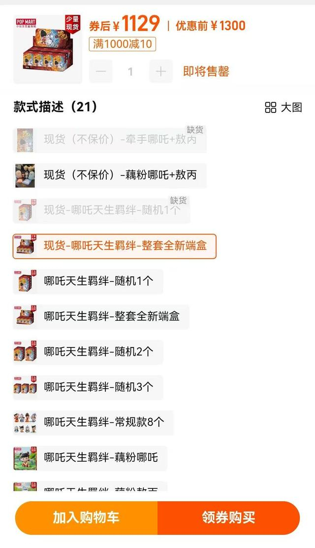 《哪吒2》与泡泡玛特的联名款“《哪吒之魔童闹海》天生羁绊系列盲盒”首批现货于1月30日在官方店铺上线,也仅此一天能购得现货,目前官方店铺的后续批次全部都处于预售状态,最新预售发货时间已经排到了5月20日,全国多地的泡泡玛特线下门店也均已售罄,但也有网友反映还有少部分抽盒机中有存货。天生羁绊系列盲盒包括隐藏款共有9款,原价为69元一个,款式随机,整盒八个原价为552元。在淘宝某盲盒店铺中,现货的全新整套盲盒价格已飙升至1129元,与原价相比涨价约两倍,已拆盒的全套常规款价格涨至606元,非现货的全套盲盒价格为623元,价格也略有上涨。