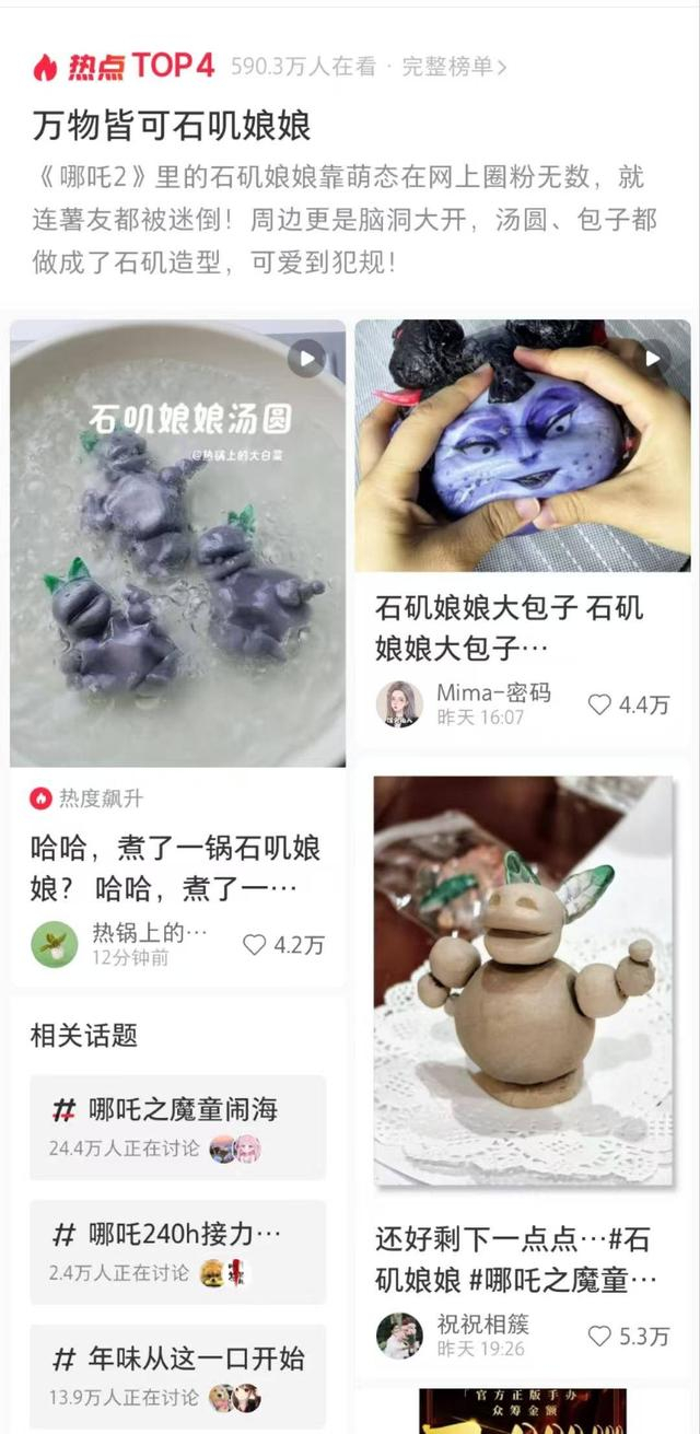 “万物皆可石矶娘娘”在2月5日成为了小红书上的一个热梗,电影中的小配角石矶娘娘意外收获相当多观众的喜爱,网友们脑洞大开自制石矶娘娘,石矶娘娘汤圆、石矶娘娘大包子、石矶娘娘粘土人等制作笔记在小红书上点赞量均超过4万。有趣的是因为石矶娘娘的热度飙升,2月3日《哪吒2》官方联名手办品牌FunCrazy宣布的众筹金额破700万元的福利就是增加开发呼声很高的石矶娘娘角色手办,在昨日晚上官方手办众筹金额破1000万元之际又将石矶娘娘手办加入了大全套赠品行列。