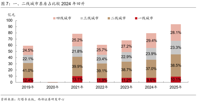 观影消费量价齐升,春节档票房创历史新高。今年除夕至初六(1月28日至2月3日),全国电影日均票房录得11.8亿元,较2024年同期增长24.9%。截至2月4日19时,2025年春节档电影总票房已突破93亿元,创下中国影史纪录。与去年的“以价换量”不同,在优质影片供给的带动下,今年观影消费呈现“量价齐升”态势。除夕至初六(1月28日至2月3日),全国日均观影人次达到2321.6万,平均票价为51元,分别较去年同期增长21.5%和2.8%。值得注意的是,今年三、四线城市票房占比并未延续往年上升态势,较2024年同期分别回落0.7和1.3个百分点,一、二线城市票房占比较2024年同期分别增加0.5和1.5个百分点。