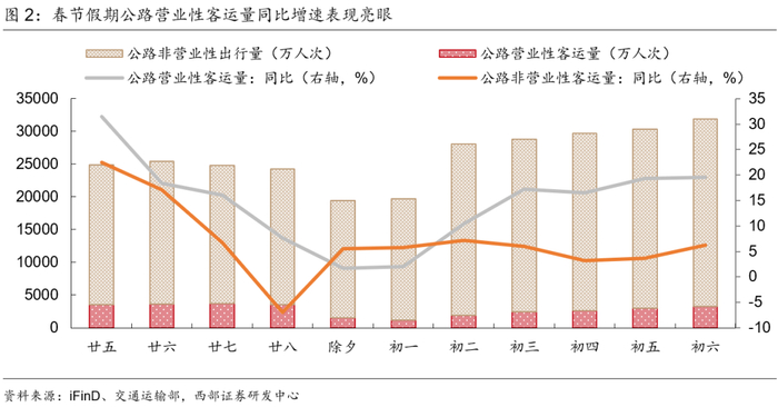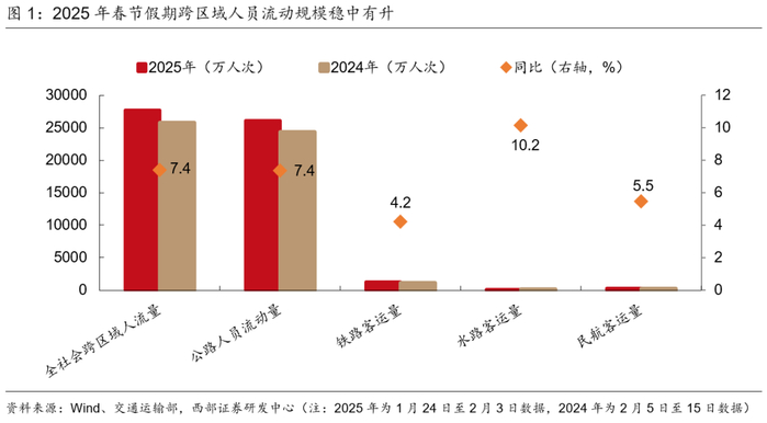 尽管人员流动的增长整体趋稳,但公路客运量的增长表现亮眼。腊月廿五至初六(1月24日至2月3日),全国公路营业性日均客运量达到2762.5万人次,较2024年同期增长15.8%。相比之下,公路非营业性出行量的增速的同比增速仅为6.5%。公路营运性客运量的统计范围主要是跨省班线、跨市班线、跨县班线、县内班线和旅游包车。这一指标的快速增长可能反映了春节“返乡探亲”以及定制游、包车游的“火热”。
