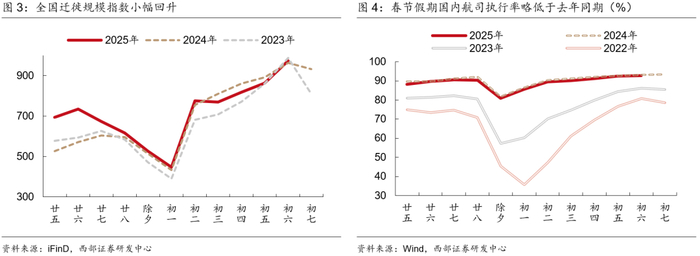 二是航司执行率和民航客运量走势出现背离。腊月廿五至初六(1月24日至2月3日),国内航司执行率(不含港澳台)和国际航司执行率较去年同期分别回落0.8和1.2个百分点。然而,交通运输部数据显示民航客运量同比增加5.5%。二者走势背离的原因可能是不同出行目的地之间的热度正在分化,热门出游目的地仍然是“强者恒强”,冰雪游和非遗游则凭借热度突围,但其他目的地热度或变得更加分散。见微知著,2025年“强者恒强”和“流量驱动”可能成为服务消费市场的新特征。