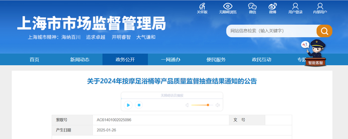 上海市市场监管局发布2024年按摩足浴桶等产品质量监督抽查结果