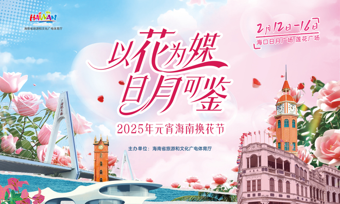 2月12日—2月16日,“以花为媒 日月可鉴”2025年元宵海南换花节活动将在海口日月广场举办。内容包括“花点心思”COSPLAY嘉年华、“全城告白”情人节特别活动、浪漫集体婚礼、“以花为媒 日月可鉴”情歌会、非遗游园、“花式告白” 红娘齐助阵、“花漾情韵”插花大赛、摇摆舞之夜&街头派对、花香美食创意市集等特色活动。