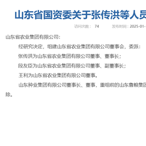日前,山东省国资委网站发布关于张传洪等人员职务任免的通知,组建山东省农业集团有限公司董事会,委派张传洪为山东省农业集团有限公司董事、董事长。