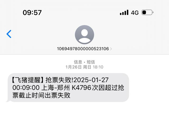 36个小时后,直到1月25日0时17分,智行App短信通知购票成功,买到1张1月27日K4796的无座车票。