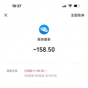 抢票未果后,高铁管家也进行了退款,澎湃新闻记者注意到,高铁管家只退款138.5元,但买票时一共付了158.5元,被扣除20元。