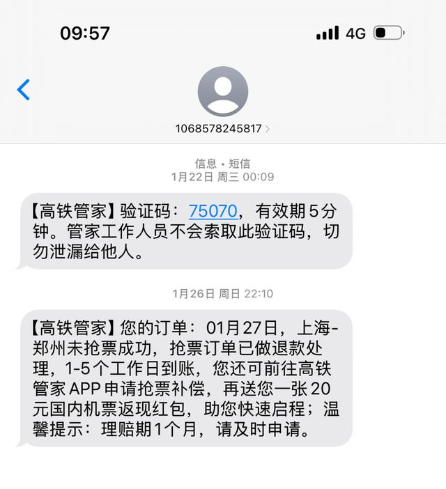 高铁管家在1月26日20时10分发消息提示抢票失败。