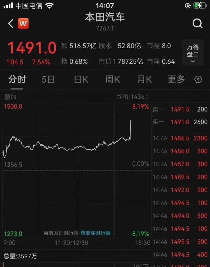 受此消息影响,本田汽车短线拉升,涨幅一度扩大至8%,截至发稿,涨7.54%。