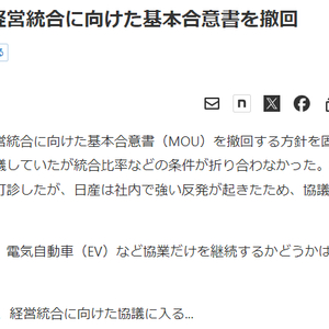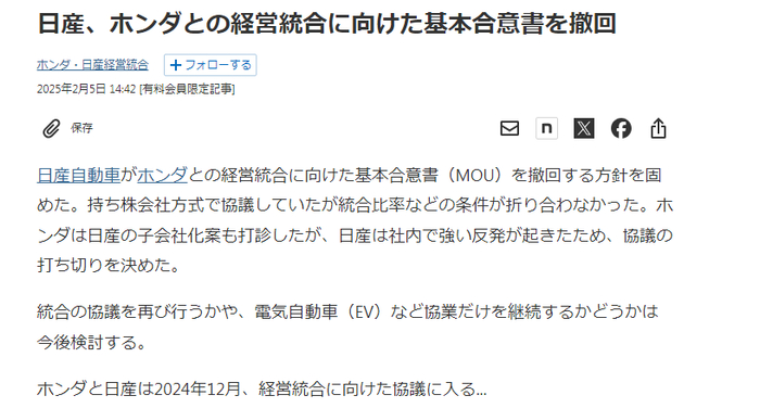 据央视新闻报道,有消息说日本汽车制造商日产汽车公司已敲定撤回与本田汽车公司进行经营统合的谅解备忘录的相关方针。双方原计划通过控股公司方式进行统合,但在统合比例等条件上未能达成一致。