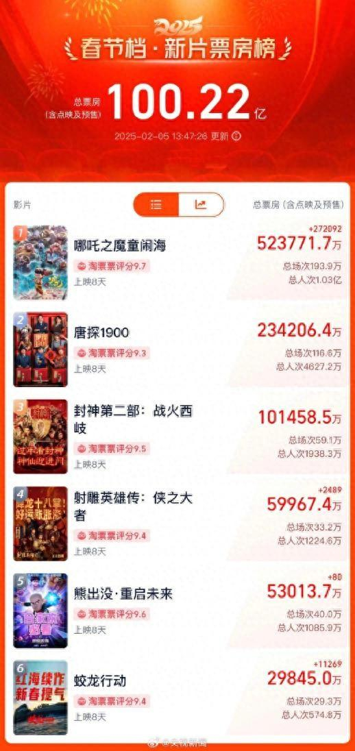 2月5日,据网络平台数据,2025年春节档总票房(含点映及预售)新片总票房突破100亿元。