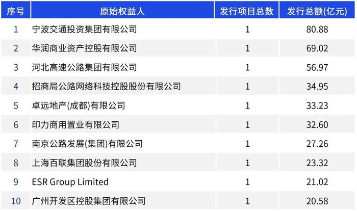 2024年,市场有29个原始权益人各发行一单公募REITS项目,其中发行规模第一的原始权益人为宁波交通投资集团有限公司,规模为人民币80.88亿元。公募REITS计划管理人共有10家,其中,中信证券股份有限公司以7个发行项目,发行总额人民币186.50亿元位居发行项目数量和规模首位。