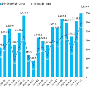 2024年,信贷ABS新发产品192单,项目数量对比去年下降4%,发行规模则大幅下降23%,发行规模为人民币2,704亿元。企业ABS新发产品1,323单,发行规模人民币11,825亿元,为四个市场类型中数量和规模最大,发行数量相较2023年上涨6个百分点。ABN新发产品570单,较去年相比数量大幅上升67%,发行规模则同比上升63%,总额为人民币5,243亿元。公募REITS类在2024年新发产品共29单,发行规模为人民币635亿元,发行数量和发行规模较2023年大幅上涨,分别上涨190%和152%。