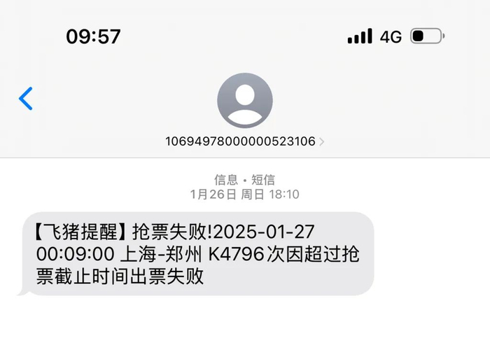 直至1月26日18时10分,飞猪App发来短信称,“因超过抢票截止时间抢票失败”,从下单到最后抢票失败,耗时约77小时30分钟。出票失败后,飞猪App全额退款153.5元。