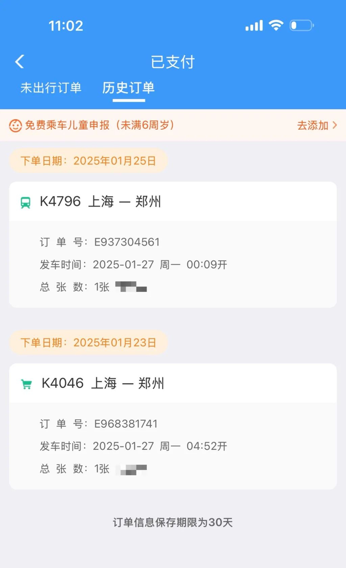 澎湃新闻记者1月23日在去哪儿网购买从上海开往郑州的K4796次列车1月27日的硬座车票。